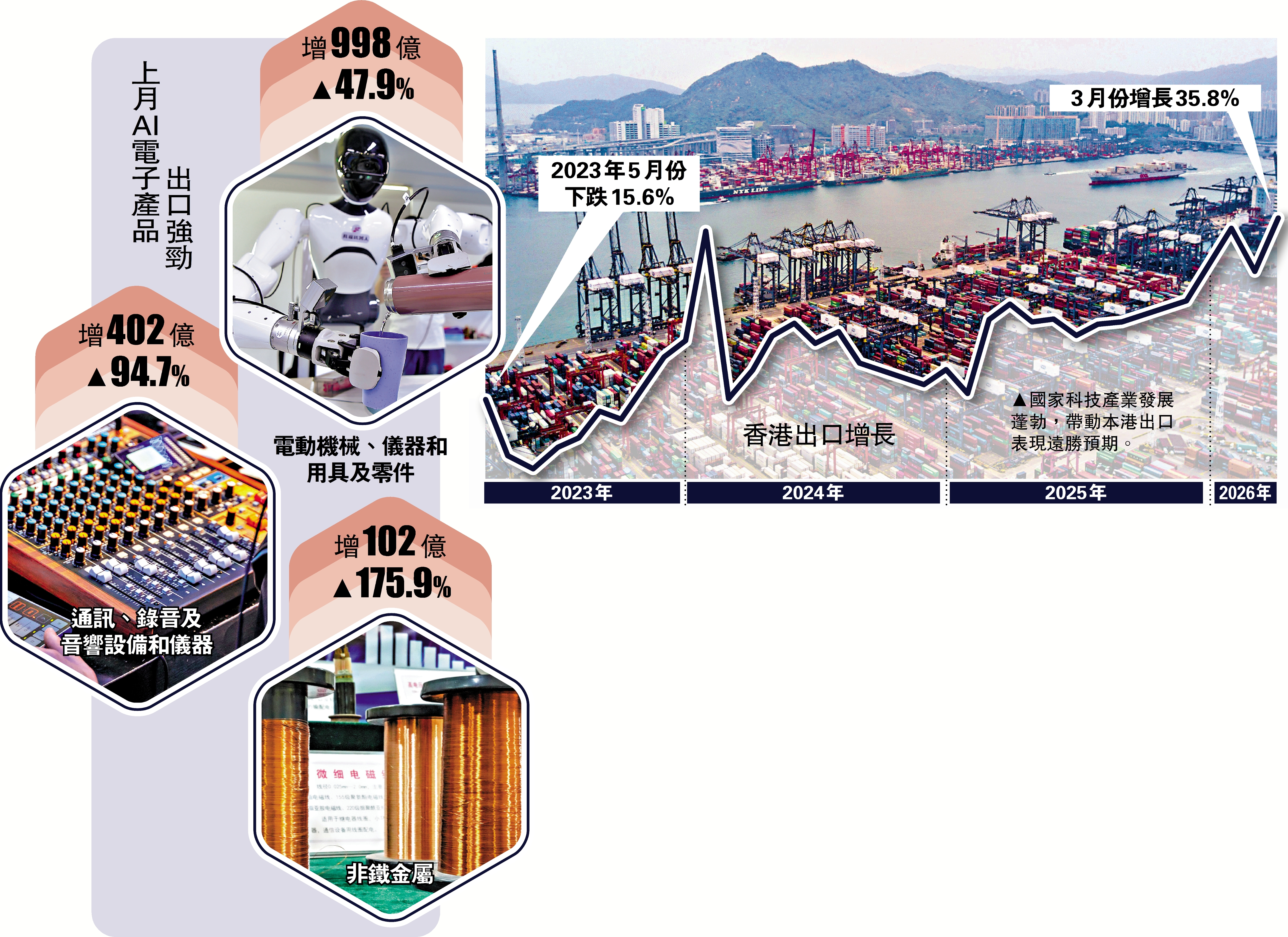 因應全球對AI及相關產品需求急升,令上月香港出口大升35.8%,為2021年1月以後高位,亦證明香港貿易樞紐優勢。在可見將來,AI熱潮不減,香港可進一步發揮超級聯繫人的角色,成為國貨出海的橋頭堡,善用香港國際化的營商環境、法制優勢、出色的檢測和專業服務,為國貨出海做足準備工作,國產AI、機器人、無人機、新能源車及自動化產品出口前景看高一線。