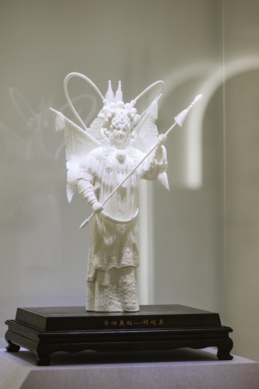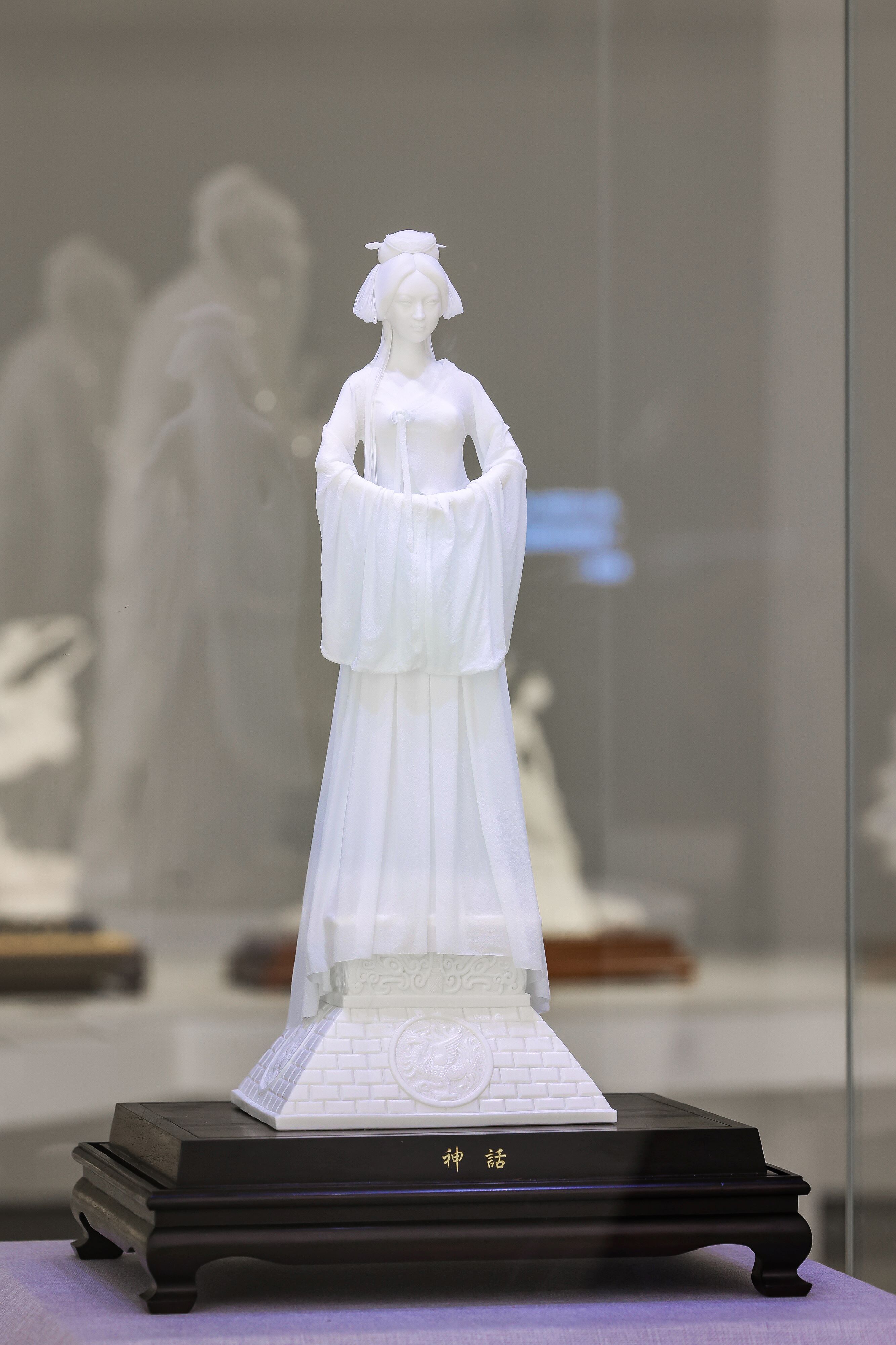 連德理的《神話》是德化白瓷高韌薄胎瓷衣技藝的巔峰之作。作品以電影《神話》玉漱公主為原型,將瓷衣厚度精準控制在0.2毫米,薄如蟬翼、輕若雲煙,遠看似紗、近看為瓷,在光影下通透靈動,完美呈現絲綢般的飄逸質感。這一技藝突破傳統瓷塑厚重質感,實現「瓷如輕紗」的視覺奇跡,既保留德化白瓷溫潤如玉的特質,又賦予作品現代雕塑的輕盈美感,彰顯當代匠人承古創新的卓越智慧。