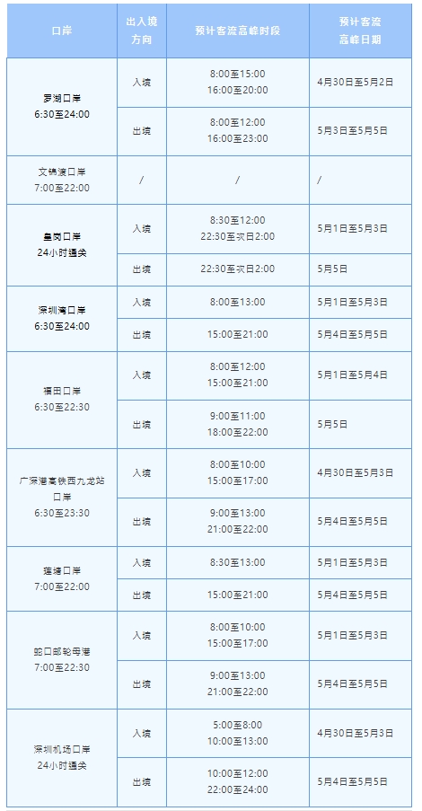 佳節將至,隨着五一小長假臨近,深港口岸將迎來出入境客流高峰。據深港口岸部門預測,假期期間日均客流量預計達94萬人次,單日峰值或突破108萬人次。為方便旅客合理規劃行程,大文現將口岸客流情況、通關指引及交通保障信息整合如下,助你無憂出行!