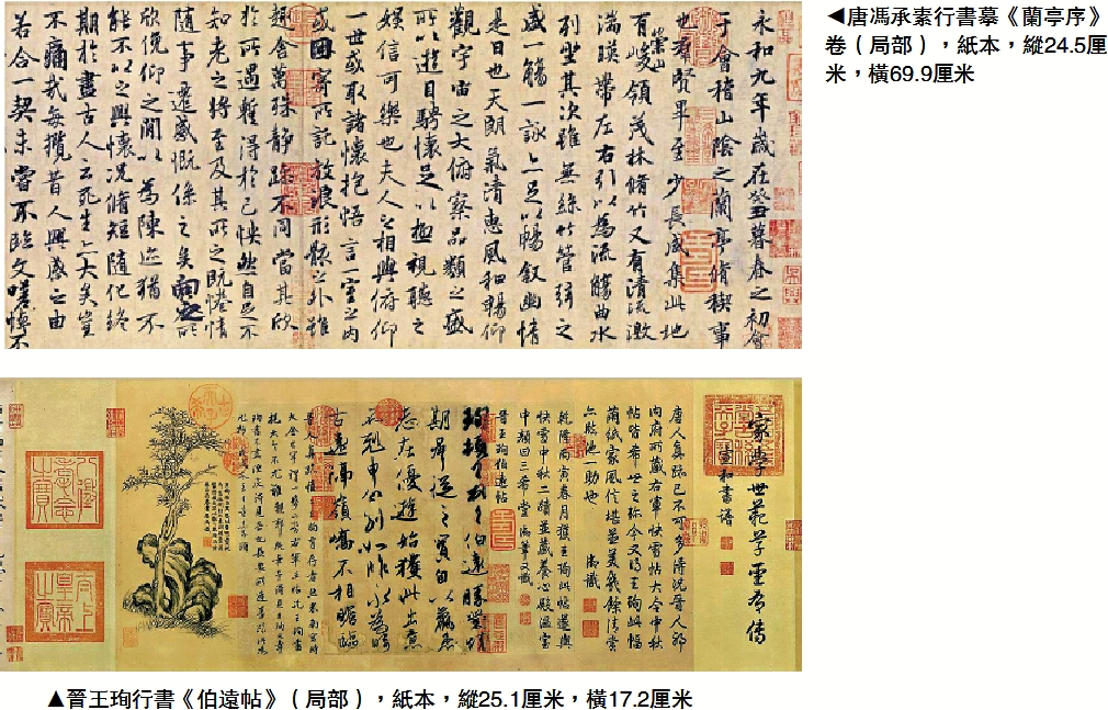 至於久負盛名的唐代《蘭亭序》神龍本亦在禁止出境展覽的珍品之列,目前亦珍藏於故宮博物院。王羲之《蘭亭序》神龍本,係馮承素摹本,紙本,行書,二十八行,三百二十四字。因卷首有唐中宗李顯神龍年號小印,故稱「神龍本」。