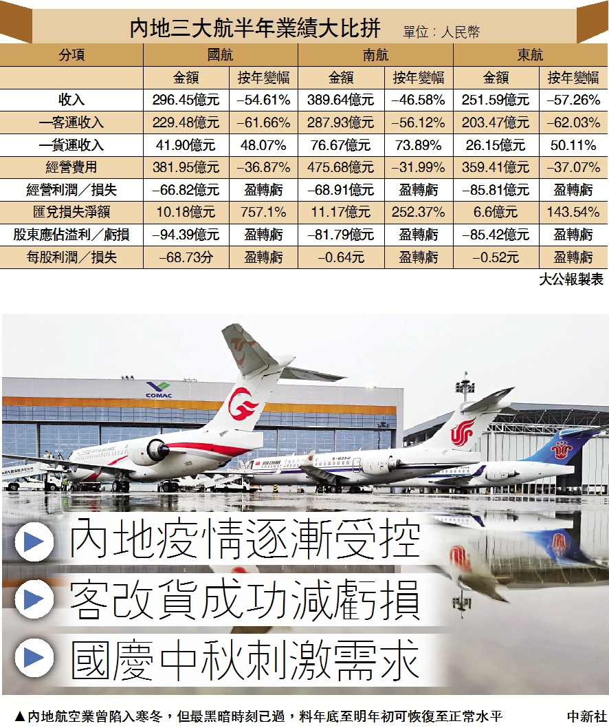 受到新冠肺炎疫情的衝擊,航空業陷入歷史性的寒冬。今年上半年,包括國航(00753)、南航(01055)和東航(00670)在內的三大航,合共錄得虧損261.6億元(人民幣,下同)。分析認為,隨着內地疫情受控,加上「國慶+中秋」假期臨近,有望成為行業恢復的助推力,料國內市場在年底至明年春運可完全恢復至正常水平,至於國際市場則需待疫苗上市才出現真正的拐點。\大公報記者 林靜文