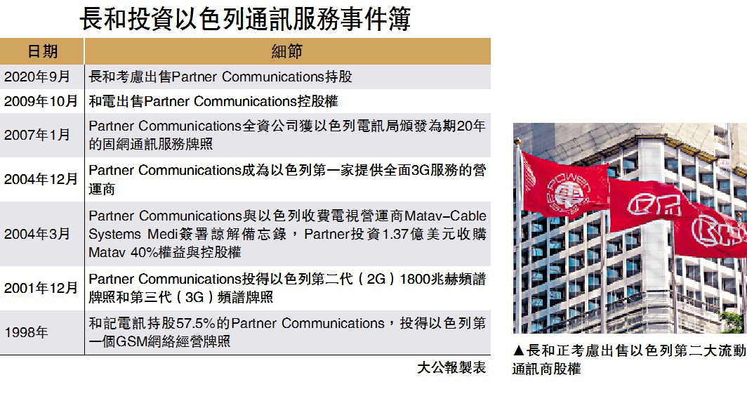 資料顯示,長和於1998年在以色列創辦Partner Communications Company Ltd.,同年,Partner投得以色列第一個GSM牌照,並推出「Orange」品牌的GSM服務,隨後亦陸續投得2G及3G牌照。在2009年,上市公司和電國際(當年編號為02332)透過附屬公司Advent Investments,向以色列Scailex出售Partner全部51.3%股權,作價107.6億港元,同時向買方提供3億美元(約23.4億港元)的賣方貸款,貸款由Partner股權作擔保。