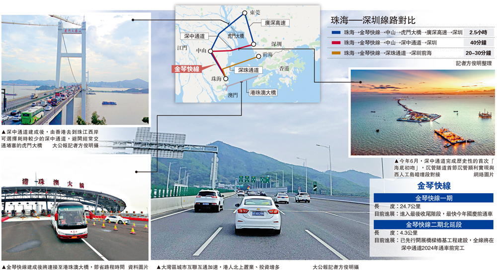 澳門─珠海─中山將新增快速通道,有望最快今年國慶前通車。記者12日從珠海交通部門獲悉,該快速通道包括金琴快線一期、二期北延段;南至橫琴新區連通港珠澳大橋連接線,北接中山東部外環高速等線路,構建粵港澳大灣區西岸同時連通深中通道、規劃中的深珠通道、港珠澳大橋三大跨江通道的縱向聯絡線。屆時,港人港車北上將更便捷,而港深中珠澳將構成一個「圈」型都市區。有在珠海、中山置業的港人估算,金琴快線建成後,港車從香港到中山等地最快僅需約50分鐘。\大公報記者 方俊明珠海報道