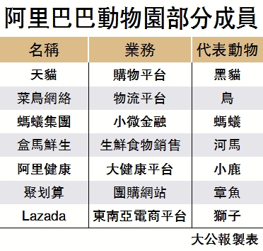 在阿里體系內,各個核心業務均以動物命名,最早有B2B業務以牛作為代表,為人熟識的電商平台天貓是以黑貓為標誌,其他還有金融科技螞蟻集團稱為「支小寶」的螞蟻、物流平台菜鳥網絡的「菜小鳥」、盒馬鮮生名為「盒馬」的河馬、阿里健康(00241)的「小鹿醫生」、Lazada的獅子「lazzlion」、聚划算的「章魚小聚」等。