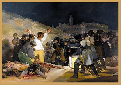 這一傳統被西班牙畫家弗朗西斯科.戈雅徹底打破。一八○八年,拿破侖的軍隊入侵西班牙,半島戰爭就此打響。五月二日,數百名西班牙人湧上街頭起義,卻僅在一天內便被法軍血腥鎮壓。一八一四年,西班牙政府為了慶祝法軍被成功驅逐,委約擅畫肖像的戈雅創作了兩幅取材於上述歷史事件的作品,意圖紀念那些因勇於反抗暴君而在起義中壯烈犧牲的西班牙人民。相比較在構圖和表現方式上借鑒了達.芬奇和魯本斯戰爭場面的《1808年5月2日》,戈雅在《1808年5月3日》展現出超越前人的原創性。