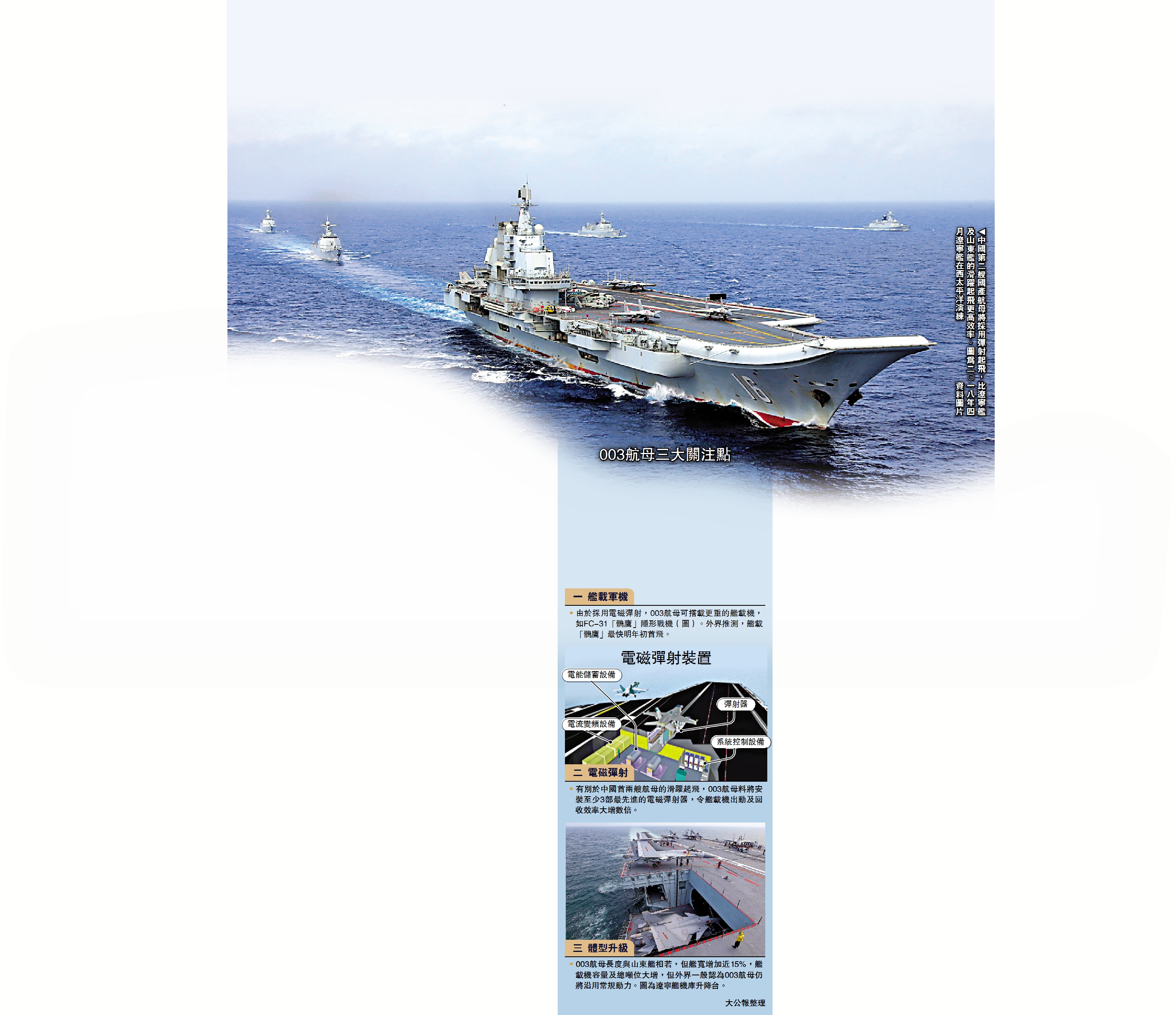 本月初,軍事專家李傑曾表示,003航母可能不會再採用滑躍式甲板,而改採彈射起飛裝置。許多跡象顯示,中國電磁彈射器技術已基本成熟,應用在003航母上的可能性極大。