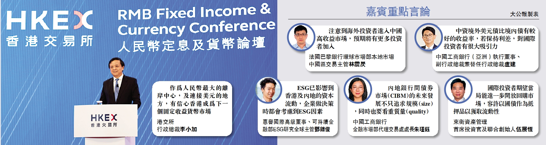 香港作為人民幣離岸中心,在人民幣國際化上亦有重要地位。李小加指出,雖然香港非最大的美元中心,亦沒有自由匯價及匯率,定息業務都由美國、倫敦等市場佔主導。但是香港是作為人民幣離岸中心同時連接美元的地方,有信心香港成為下一個固定收益貨幣市場。李小加形容內地已有很龐大、已建成的境內定息和貨幣市場,當內地認為國際化市場需要不同的制度和生態,香港有望突圍而出。