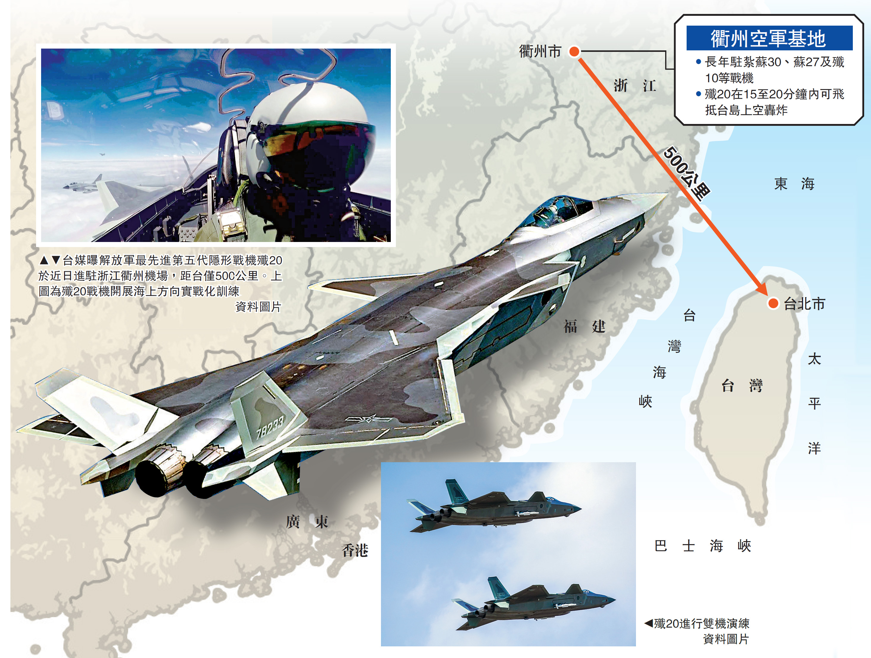 台媒26日報道,大陸對台軍事鬥爭第一線廈門、衢州傳出戰車與戰機部署,其中綽號「威龍」的第五代隱形戰機殲20現身浙江衢州機場,報道稱該機場距台北僅500公里,殲20向北飛7至8分鐘,台軍巡航戰機就會進入殲20長程導彈有效打擊範圍,15至20分鐘就能飛抵台島上空轟炸。此間軍事專家指出,這是解放軍抗衡美軍艦載隱形戰機具體行動之一,殲20的部署不僅是為了應對台軍戰機,更是對近期不斷抵近南海的美軍的一次威懾。\大公報記者 馬靜、凱雷北京報道