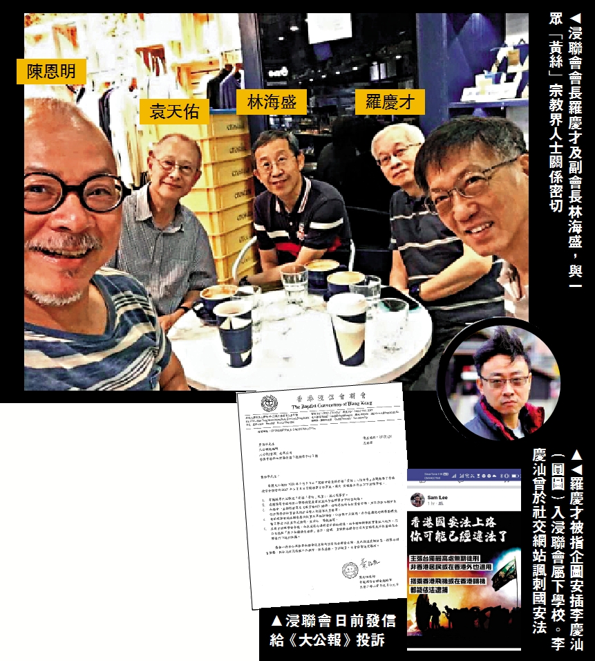《大公報》9月9日報道「浸聯會會長謀安插黃絲入校董會」,香港浸聯會總幹事葉約但牧師日前來信否認報道,但未能提出具體根據。《大公報》曾揭現任會長羅慶才、副會長林海盛及書記李慶汕反國安法的「黃絲」政治立場,並於七月報道浸聯會常務委員會涉肆意修改校董會名單。上月9日《大公報》跟進報道,卻被浸聯會指稱失實,《蘋果日報》未釐清事實,迅即報道,配合該報的政治化輿論,抹黑《大公報》。\大公報記者 施文達
