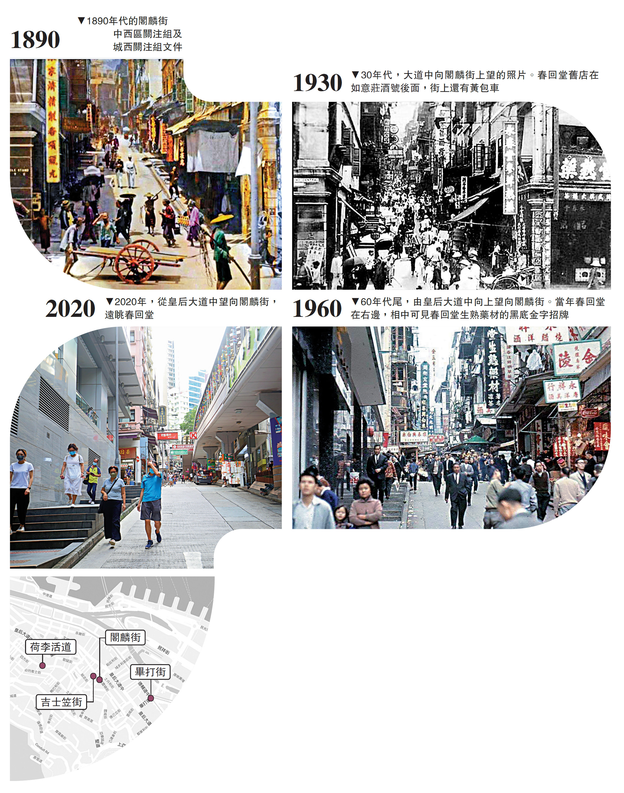 三十年代,春回堂的舊舖就在現時舖位的斜對面,即現在便利店的位置。林偉正展示舊照片說,從皇后大道中向閣麟街上望的照片可見,現在春回堂舖位仍是木樓,對面是大華國貨公司,街上人來人往,有藥材舖、米舖、酒莊、燒味店、南貨店等,可見民以食為天。細心看還可觀察到燒味店前掛有「臘味會」的廣告,證明當時的市民即使收入不多,仍十分重視冬至等傳統節日。