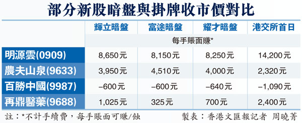 以新「凍資王」農夫山泉(9633)為例,超額認購超過1,100倍,凍結資金6,424.11億元,打破12年前中鐵建(1186)的紀錄。如此受歡迎,因重磅基石投資者和大戶搶走了大比例發行規模,散戶投資者可認購的比例偏低,超購倍數如此之大。供不應求令暗盤交易異常活躍,其股價最高曾飆升1.5倍;但掛牌收市升逾50%,無暗盤表現如此狂熱。