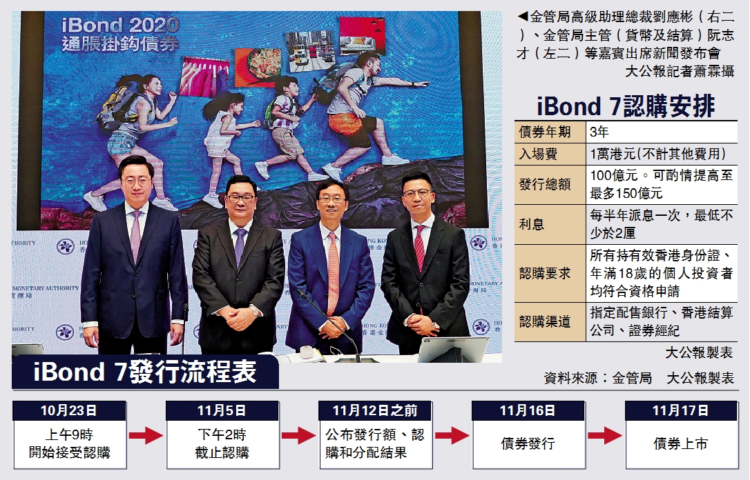政府推出的第七批通脹掛鈎債券(iBond 7)將由10月23日(星期五)起接受合資格香港市民認購,預計將於11月12日前公布結果。金管局高級助理總裁劉應彬形容新一批iBond為過往六批的「加強版」,最大的兩項分別包括:定息部分由1厘提高至2厘,發行總額可酌情由原訂的100億元增加至150億元。他相信iBond 7有吸引力,但無意猜測市場反應。