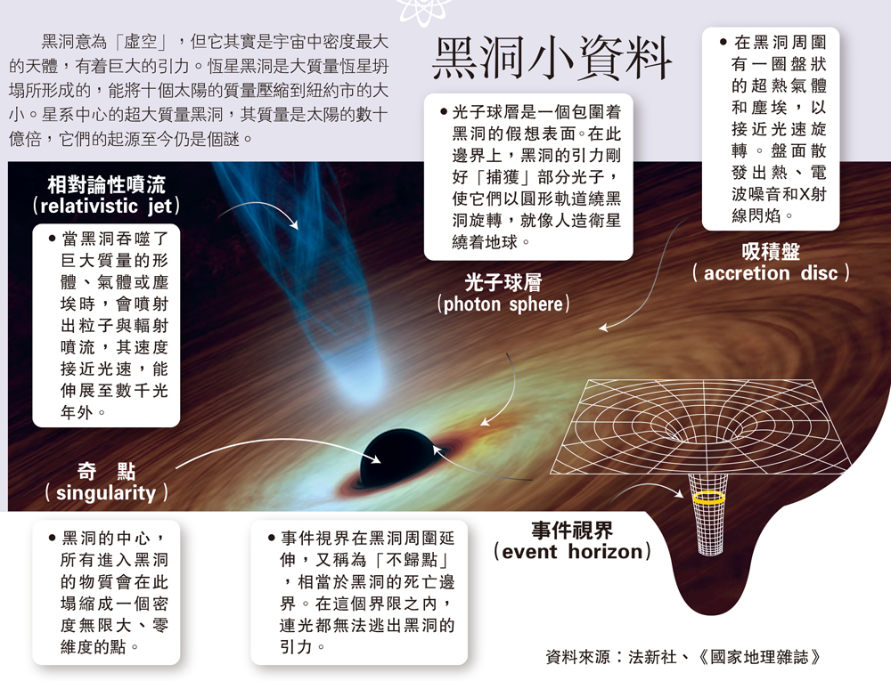 •事件視界在黑洞周圍延伸,又稱為「不歸點」,相當於黑洞的死亡邊界。在這個界限之內,連光都無法逃出黑洞的引力。