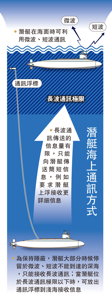 •為保持隱蔽,潛艇大部分時候停留於微波、短波不能到達的深海,只能接收長波通訊;當潛艇位於長波通訊極限以下時,可放出通訊浮標到淺海接收信息