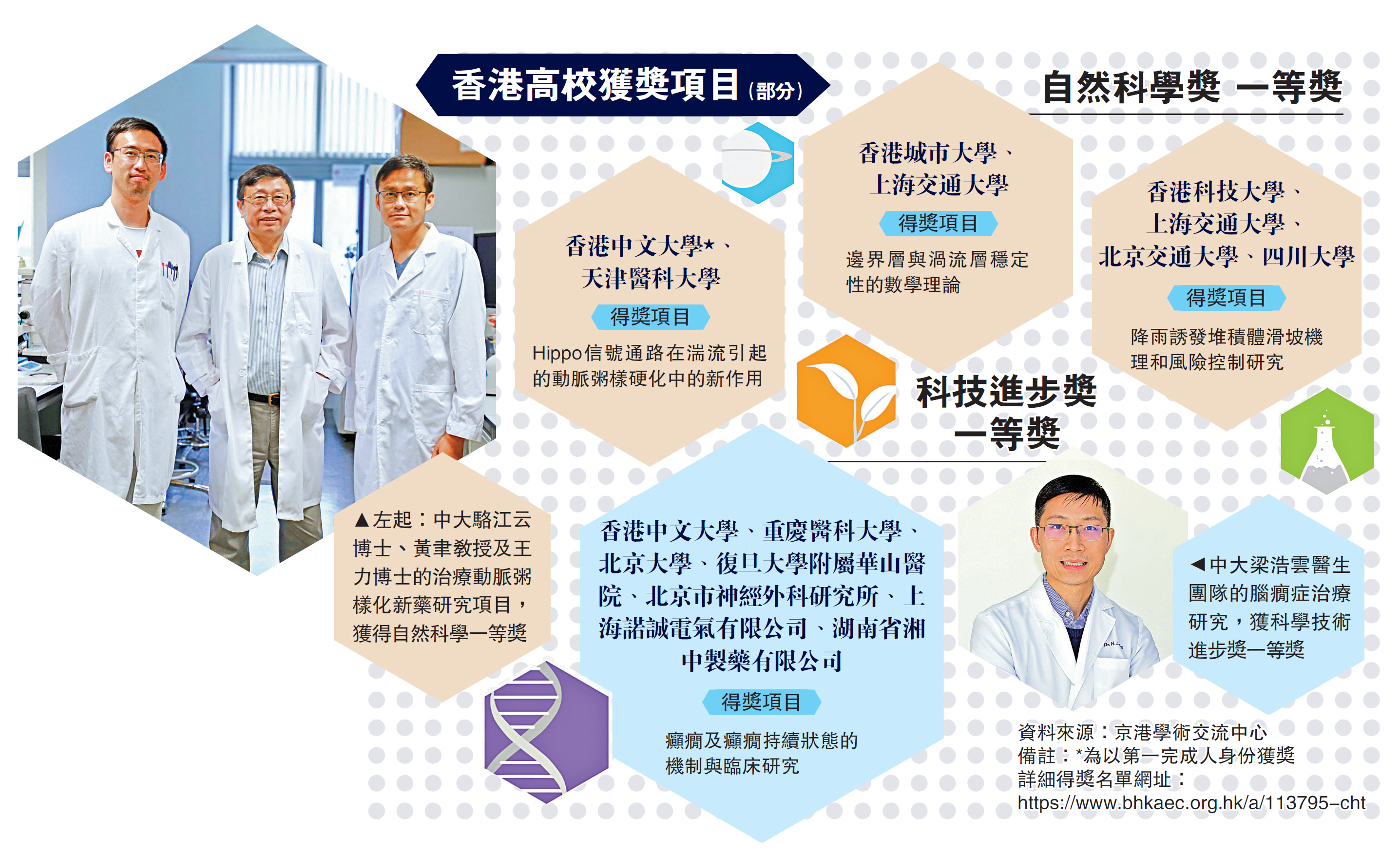 而獲得自然科學獎一等獎的,則是中大醫學院生物醫學學院教授黃聿、王力及駱江云的研究項目「Hippo信號通路在湍流引起的動脈粥樣硬化中的新作用」,該項目則是和天津醫科大學合作,找到治療動脈粥樣化的新藥。