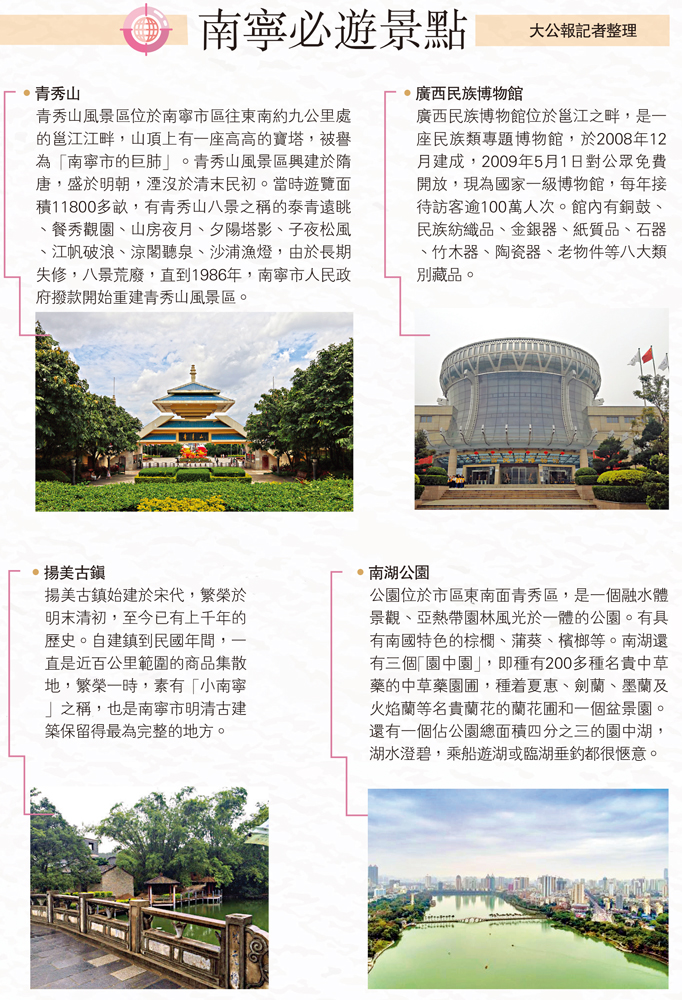 青秀山風景區位於南寧市區往東南約九公里處的邕江江畔,山頂上有一座高高的寶塔,被譽為「南寧市的巨肺」。青秀山風景區興建於隋唐,盛於明朝,湮沒於清末民初。當時遊覽面積11800多畝,有青秀山八景之稱的泰青遠眺、餐秀觀園、山房夜月、夕陽塔影、子夜松風、江帆破浪、涼閣聽泉、沙浦漁燈,由於長期失修,八景荒廢,直到1986年,南寧市人民政府撥款開始重建青秀山風景區。