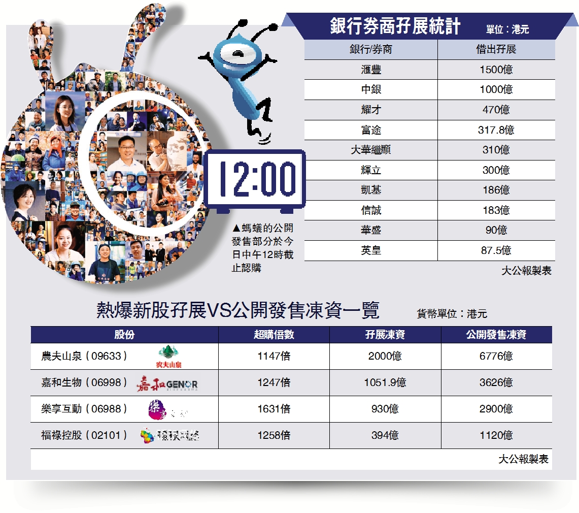 螞蟻集團(06688)結束孖展認購,歸納多家券商銀行統計,合計孖展凍資逾4700億元,遠超上一任凍資王農夫山泉(09633)的2000億元孖展凍資額。值得留意的是,農夫山泉最終凍資6700億元,即不少散戶投資者並非孖展申請,以此推算,螞蟻最終申購金額有機會超過一萬億,證券界人士料其認購人數與凍資額均將打破香港開埠以來紀錄。有意認購的散戶需留意,公開發售部分將於今日中午截止,且只能以現金申請。\大公報記者 吳榕清