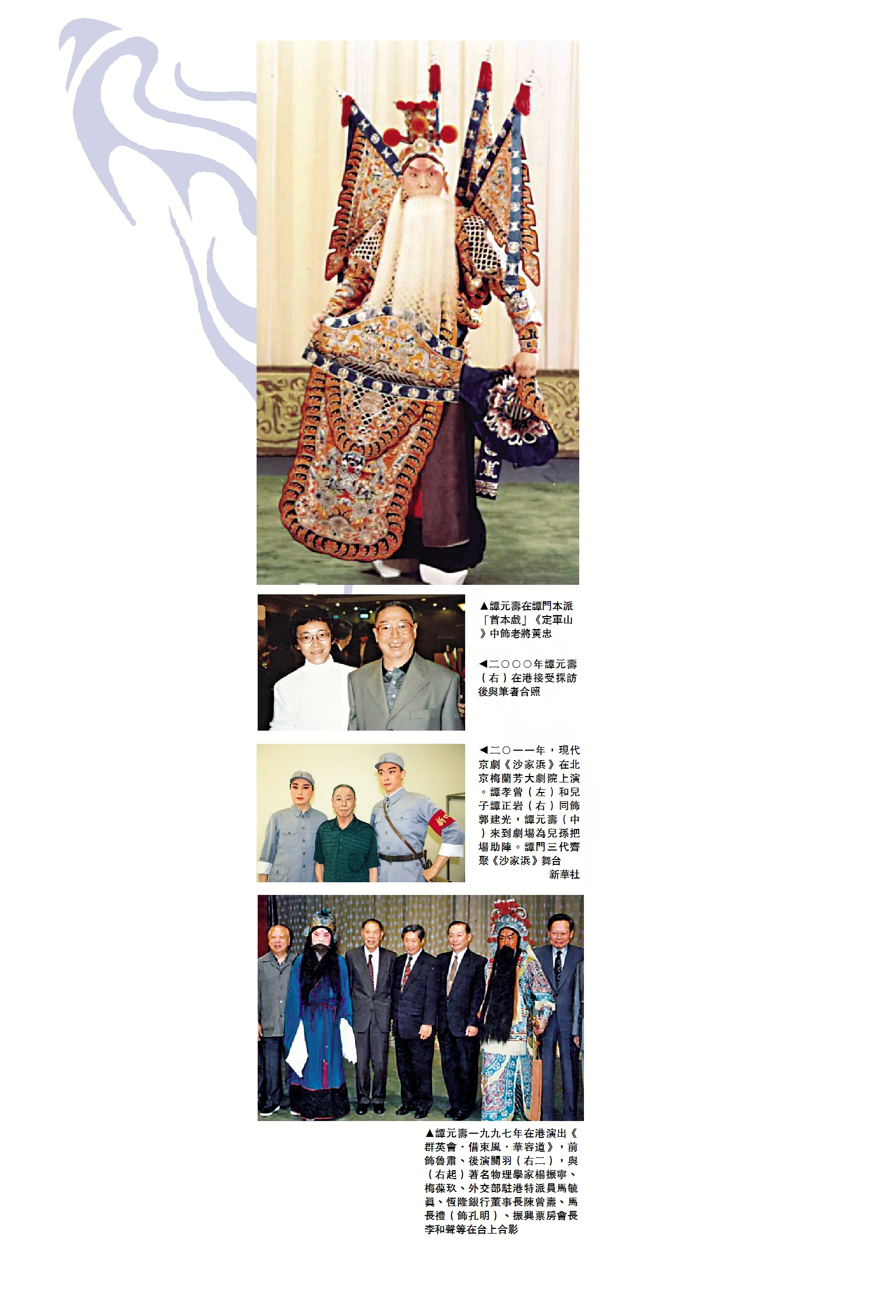 譚老師生前曾經表示不喜歡人家叫他藝術家,只肯接受「著名京劇演員」的稱謂;他過世後,內地悼念文章有稱之為「一個時代的終結」,也有人哀嘆「京劇界最後一個標桿、旗幟式人物走了」……這些說法,譚老師肯定也不會愛聽,不是故作謙虛,而是真的不同意。\葉中敏