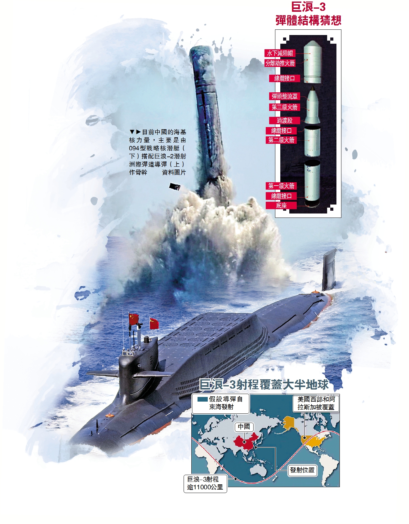 巨浪-3潛射洲際彈道導彈是目前中國最先進、威力最大的潛射導彈,目前已經完成工程研製,正在有序進行測試和部署準備。官方披露研發團隊資料時透露,巨浪-3「投送距離世界第一」,超越美、俄兩國現役裝備,最大射程料逾1.1萬公里,由東海發射可抵北美西岸,服役後搭配094A型核潛艇執行戰備巡邏,將極大夯實中國的海基核打擊力量。\馬浩亮(文)