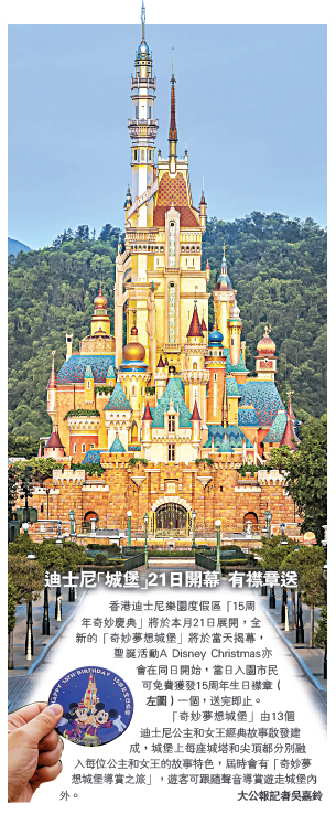 香港迪士尼樂園度假區「15周年奇妙慶典」將於本月21日展開,全新的「奇妙夢想城堡」將於當天揭幕,聖誕活動A Disney Christmas亦會在同日開始,當日入園市民可免費獲發15周年生日襟章(左圖)一個,送完即止。