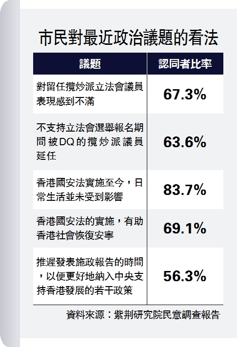 紫荊研究院指出,國安法實施四個月以來,絕大多數市民對此反應正面,情況令人欣慰,也再次證明有關抹黑國安法的言論純屬無稽之談。而在新冠疫情之下,市民亦普遍期待特首能在接下來的施政報告中有效回應市民訴求,重振社會信心。另外,對於因勾結外國勢力、支持「港獨」、觸及國家安全和「一國兩制」底線而曾被取消參選資格的立法會議員,市民普遍強烈質疑他們留在立法會的正當性,問題值得引起重視。