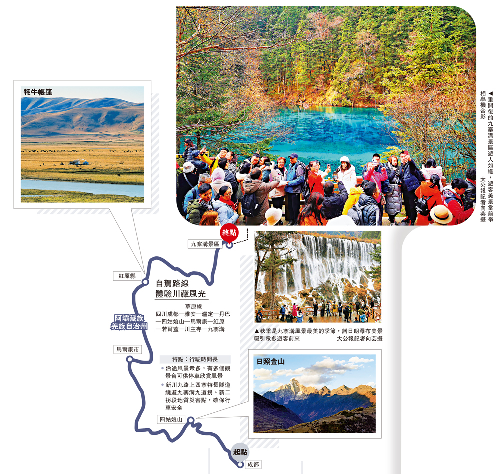 「九寨歸來不看水」,雪峰、雲海、彩林、疊瀑……當深秋初冬的畫筆落到九寨溝時,這裏便美成了「童話」。11月8日是「8.8」九寨溝地震災後恢復重建三周年,大公報記者近日走進九寨溝,一探「補妝歸來」的「童話世界」。有遊客向記者感嘆,「九寨溝的秋天真的太美了。」\大公報記者 向芸