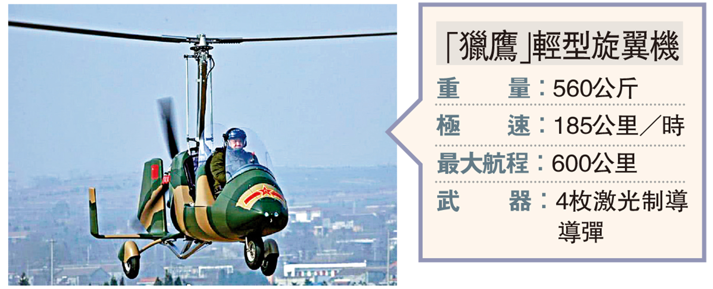 「獵鷹」輕型旋翼機是察打一體的新型裝備。由於旋翼沒有動力和減速系統,噪音低,目標小,具有使用環境要求低、操作簡便、隱身、立體突防等特點,適合配備在特種作戰部隊,用於特種偵察、滲透、破襲等任務。