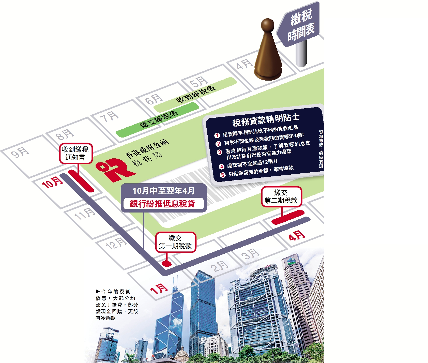事實上,申請人還要看清楚每月還款額,了解實際利息支出及計算自己是否有能力還款。一般而言,稅務貸款還款年期不宜超過12個月,因為下年同一時間又要繳交下一年的稅款。現時稅貸利息雖然低,但正如政府宣傳口號「借定唔借,還得到先好借」,打工仔應為自己訂立目標,定期儲蓄以應付稅項,便不用申請稅貸。