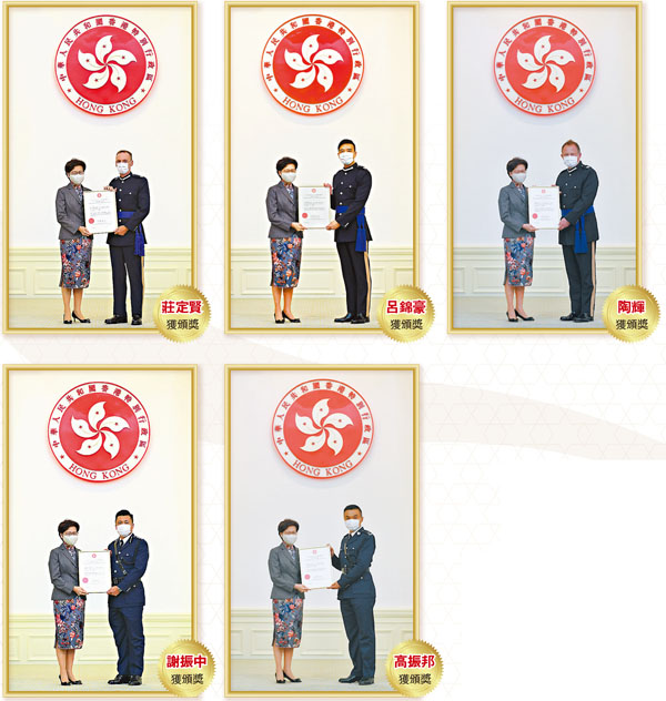 獲頒行政長官公共服務獎狀的人士中,不乏各個紀律部隊,包括香港警務處、消防處、懲教署、入境處等。多名警務人員因過去一年執行職務表現出色而獲得表揚,其中警務處助理處長莊定賢曾擔任總部應變大隊指揮官,現為水警總區指揮官;警務處助理處長陶輝於去年6月12日包圍立法會事件中進行驅散行動;警務處助理處長呂錦豪曾在修例風波期間出任東九龍總區應變大隊,現為東九龍總區指揮官。