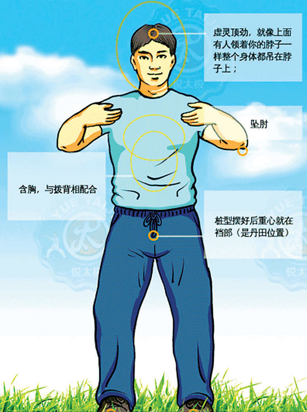 站樁的姿勢卻也是非常有講究的:這裏給大家介紹的是一種最基本的站樁補氣法,在練習站樁前,應排空大小便,而且飯前、飯後一小時不宜練習。