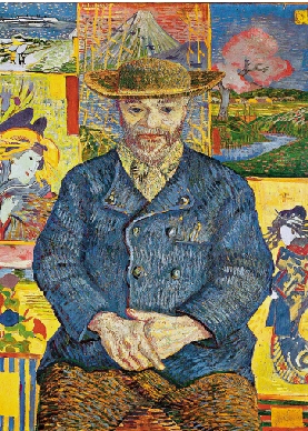 此外,和很多畫家在作品中加入日本裝飾元素的做法不同,梵高除了以多幅浮世繪作為此幅肖像的背景,還吸收並採用了很多相關的日本木刻版畫創作手法,使之與西畫技法融會貫通。比如,男主人公的藍色外套以大面積明快的平鋪色塊繪製,並未用陰影來突出立體感;人物的外形勾勒摒棄了傳統的漸隱法而使用了清晰的輪廓線,使人物在摒棄三維透視法的表達方式後仍舊得以從平面中跳脫……對東方繪畫元素的運用也讓梵高的藝術成功實現了「中西結合」。