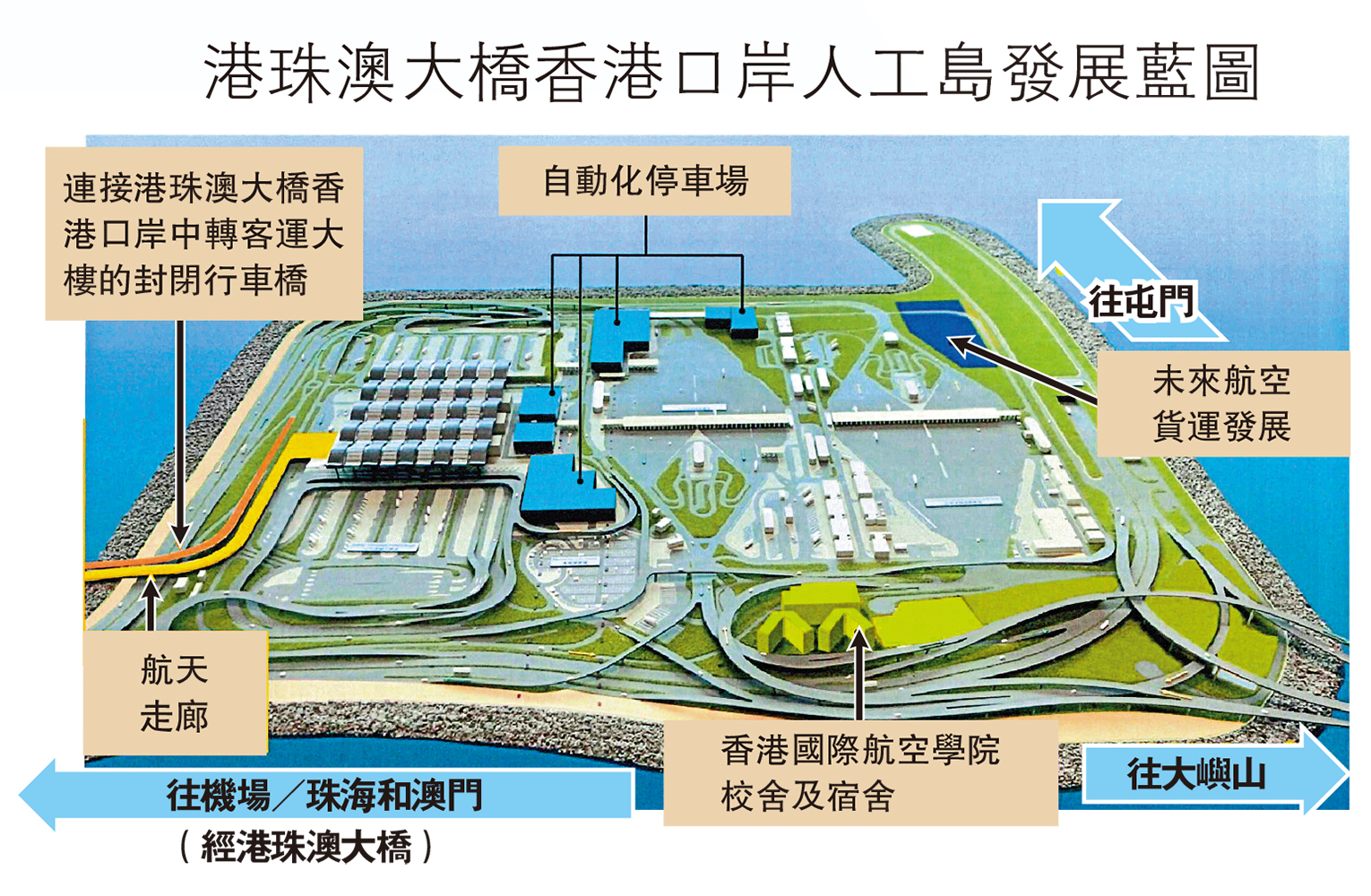 施政報告提到發展「機場城市」,有關港珠澳大橋香港口岸人工島發展規劃藍圖昨日在記者會上首次曝光。擬議興建的自動化停車場設於口岸旅檢大樓東面,可供日後來自廣東及澳門並經港珠澳大橋前往香港機場轉飛海外或訪港的自駕旅客使用;香港國際航空學院及學員宿舍將建於人工島南端;人工島東北角則預料了用地作航空貨運發展。