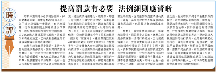 事實上,香港疫情經過將近一年還未能受控,原因是多方面的。當務之急是必須採取一切可行的措施,全力把疫情壓下去,並努力實現行政長官在最新施政報告中提出的「清零」目標。因此,多數市民都支持將違反防疫規定的罰款大幅度提升,令到所有市民保持對病毒的高度警惕,嚴格遵守有關規定,讓本港疫情盡快消失。同時,也有一些社會人士建議,政府在決定採取這項措施之前,對於市民如何才不會違反政府規定,避免被處以高額罰款,應該有一個更加清晰的指引。特別是限聚令存在很多灰色地帶,對於哪些行為可以豁免、什麼樣的聚集屬於違法等等,當局必須作出更加清晰的界定。至於執法人員應該如何執行罰則,也需要有規範化的程序,做到有章可循、有規可依,避免不必要的爭拗。被罰者如果不服的話,應該如何去抗辯,有什麼樣的權利保障,也需要讓廣大市民知道。另外,建議當局對生活困難或低收入的違法者,如領取綜援人士,可以採取社會服務令等其他替代的處罰措施。