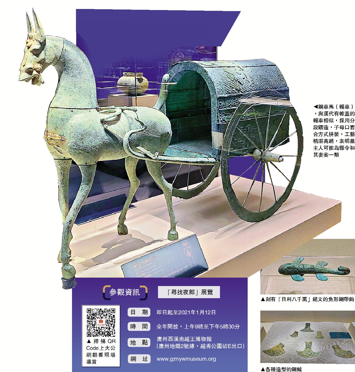 烏蒙山東南緣、南北盤江所夾的山間壩子一帶,發現一處以青銅製造為主的銅鼓山遺址,出土一批青銅鑄造的範模,為夜郎青銅文明的發展提供了考古支持。《尋找夜郎》中亮相的眾多青銅器,在形制上大都受中原文化的影響,或與周邊青銅文化有着關聯,正是夜郎文化與中原及世界其他文明雜糅發展的表現,其中飾虎銅釜、牛頭形銅帶鈎、龍首柄銅釜、武陽傳舍比二鐵爐、銅車馬(輜車)等,均是難得一見的文物精品。