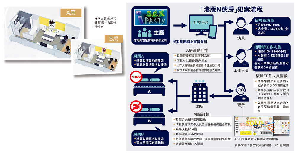 警方指,該公司每月有四個拍攝日,每日有多場表演,會有不同演員演出,在A房的表演每位觀眾收費700元,通常每場表演有四個演員和兩個觀眾,而在B房的性交易價格由500至3000元不等,通常是一位演員和一位觀眾,其間不作拍攝。