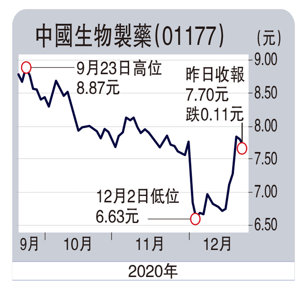 集團以5.15億美元買入北京科興中維15.03%權益。科興中維主要從事人用疫苗的研發業務,在新型冠狀病毒肺炎疫苗CoronaVac的開發取得了重大進展,是目前中國為數不多自行研發生產新冠疫苗企業之一。於4月13日,CoronaVac正式獲得中國國家藥品監督管理局批准進行臨床研究,隨後又獲得巴西、印尼、土耳其及智利等國家的三期臨床試驗許可,已獲得多國的疫苗訂單。而集團資深副主席謝炳早前三度增持公司的股份,最近一次在12月11日斥資約1億元,以平均價每股6.73元購買1500萬股,持股量由8.32%增至8.4%。目前股價已由近月低位6.5元回升,只要守在50天線(目前約7.45元)之上,相信升勢可以持續。