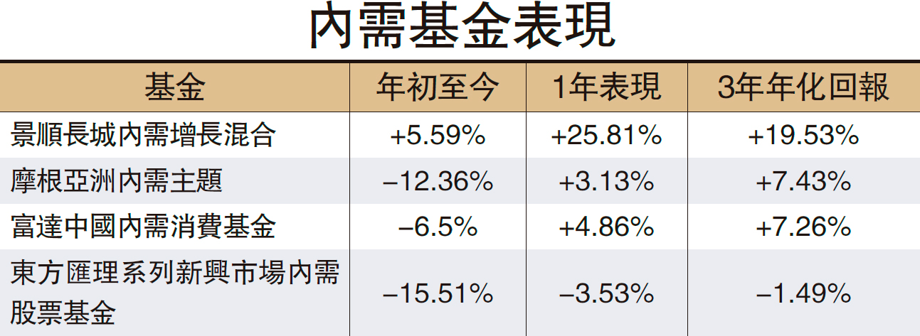 隨着內地疫情受控,內需行業如餐飲、零售及娛樂等已陸續復工及恢復營業,因此市場憧憬內地消費需求將會反彈。如要投資中國消費股份,現時市場亦有以中國內需主題的基金,過去一年回報高達25%。另外,亦有兩隻分別在香港及美國上市的ETF,入場費相對較低,投資者可以考慮自身的投資喜好,選擇基金或是ETF。\大公報記者 王嘉傑