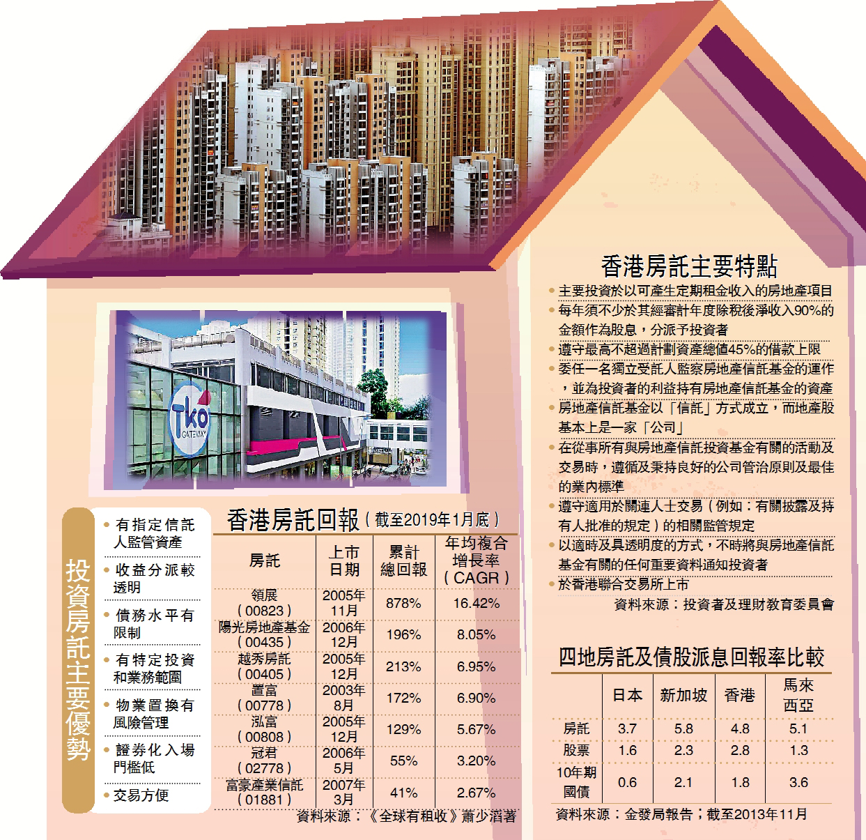 華人對於擁有物業的情意結深厚,撇除自住的物業不計,蕭少滔指買樓收租的回報率一般約為2.3%,香港地產收租股的派息率介乎3%至5%,而香港房託的年度收益率約為5.6%,回報相對較高。
