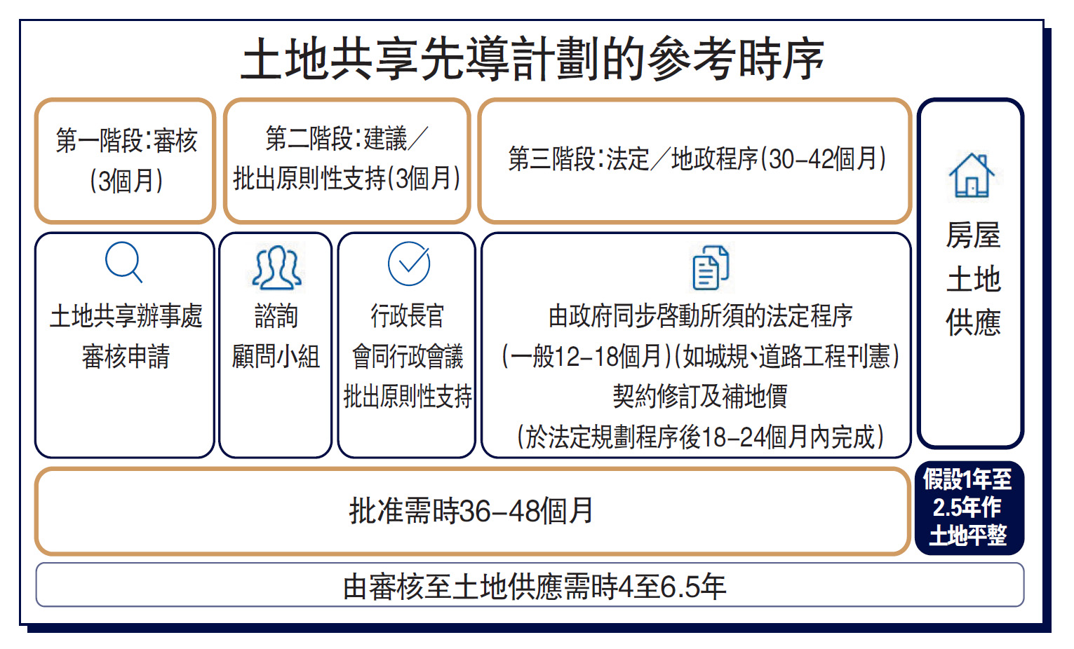 先導計劃將按三個階段落實工作流程,只有在第二階段獲顧問小組支持的個案,才會呈交行政長官會同行政會議尋求原則性同意。黃偉綸續稱,土地共享辦事處會壓縮時間,盡量同步進行法定程序,以節省時間,土地契約修訂或換地過程期望在18個月內完成,只有個別進展良好的個案,才可獲延長一段合理時間。政府目標是在4至6年半內便將土地由生地變熟地,以興建房屋。