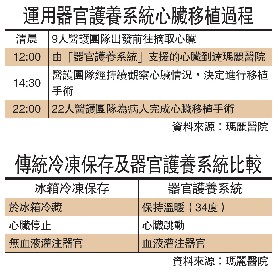 「器官護養系統」於歐洲國家已應用超過十年,去年曾在美國的國際醫學會議展示,報告顯示81%「邊緣心」使用系統後適合於心臟移植。瑪麗醫院於2018年底研究引入,派出兩隊醫護人員前往學習相關技術。瑪麗醫院心胸外科部門主管區永谷稱,相關儀器可支援更遠距離器官運送作移植手術之用,亦可擴展應用於肝、肺、腎等其他器官的移植。