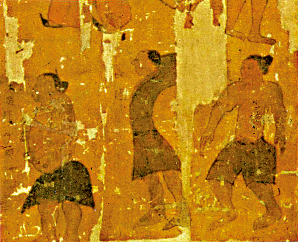 印象最深刻的,是於湖南省博物館所見西漢時期「導引圖」帛畫,一九七三年長沙馬王堆出土,縱約五十公分,橫約一百公分;藏漆奩內,由於長期積水浸泡,已成殘塊,出土後經整理復原;前段另有兩種古佚書。帛畫自上而下共四層,每層各十一人,做着不同姿態的「導引」動作(包括呼吸運動)(附圖是帛畫的一小部分),包括莊子《刻意》篇的「熊經鳥伸」等仿熊和鳥的動態;帛畫近半數更為女性。這件珍罕文物足以反映氣功早已流行民間。