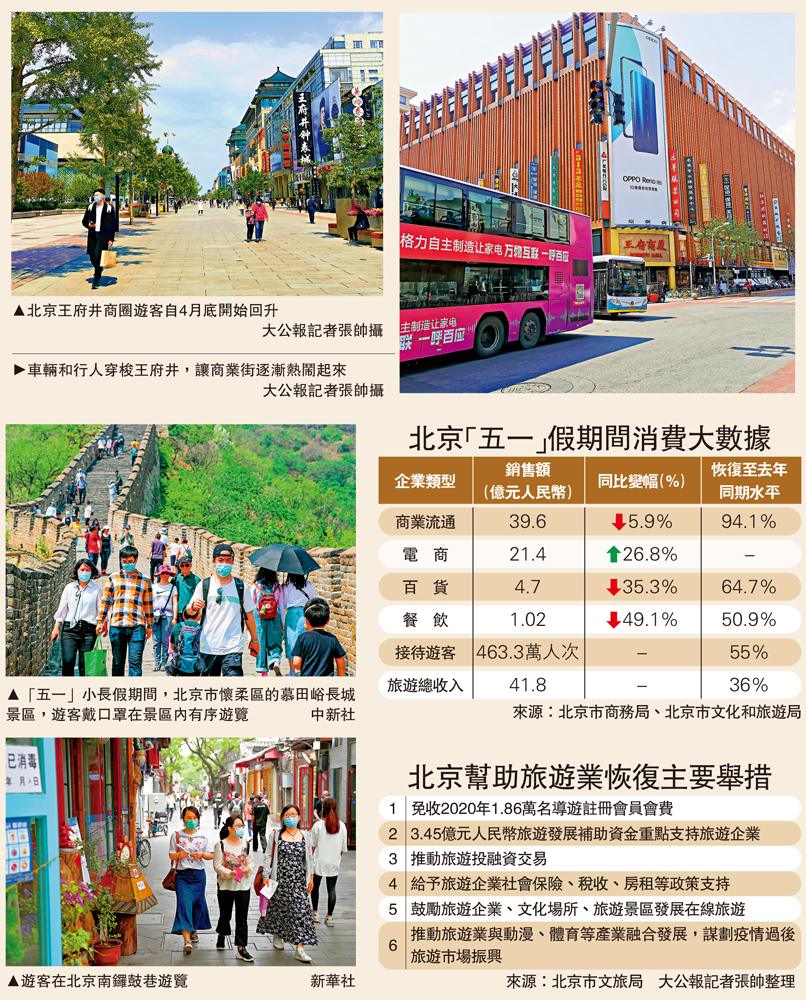 全長892米的王府井大街位於北京城市核心地段,老字號和新時尚巧妙共存,使這裏一直是北京城最繁華的商業街,素有北京「金街」之稱。大公報日前採訪了解到,因新冠肺炎疫情影響,王府井「五一」前客流銳減近八成。「五一」後,王府井大街人流較清明假期回升。截至昨日,北京各大商場、商圈中的體驗型消費場所開始重啟加速,兒童樂園、運動場館回歸,消費的盛夏可期。\大公報記者 張帥 王芳凝 彭巧容