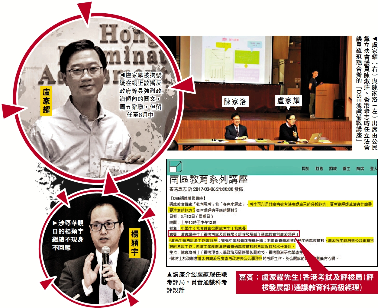 眾志宣傳該講座時,特別介紹盧家耀在考評局工作逾18年、負責通識科的考評設計和水平釐訂等。而同場嘉賓有公民黨陳家洛,眾志介紹其「曾參與高級程度會考(即DSE前身之一A-Level)政府與公共事務科的考評工作,對公開試的評分準則素有心得」;巧合的是,盧家耀曾是該工作的負責人,二人疑曾共事。