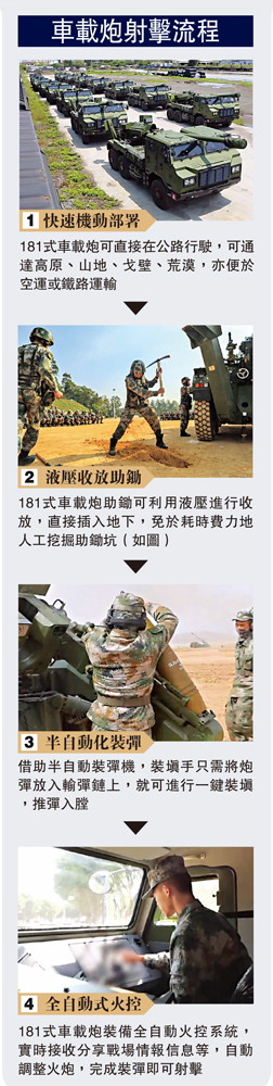 181式車載炮裝備全自動火控系統,實時接收分享戰場情報信息等,自動調整火炮,完成裝彈即可射擊