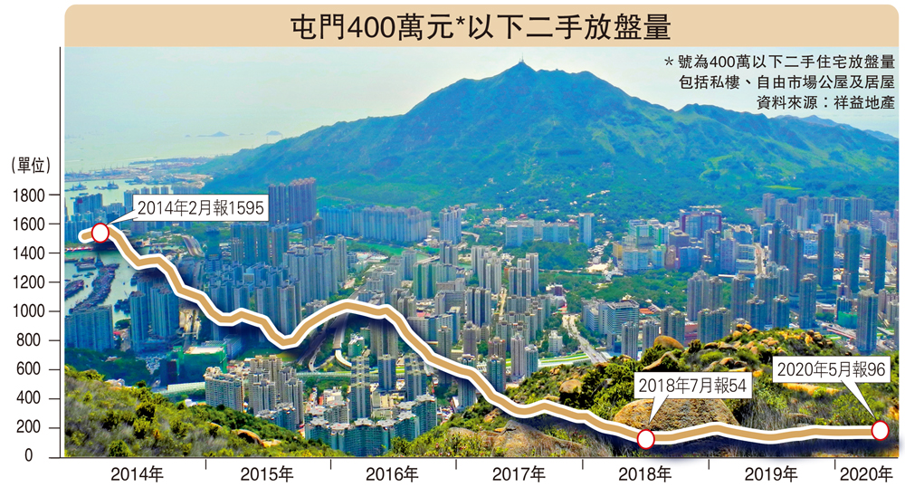 儘管如此,隨着樓價近年飆升,屯門上車盤供應量與6年前比較明顯減少。據祥益地產資料,2014年1月屯門400萬元以下放盤達1559伙,同年底已減至1041伙,翌年跌穿千伙後持續拾級回落,直至目前不足百伙,較6年前大跌94%。