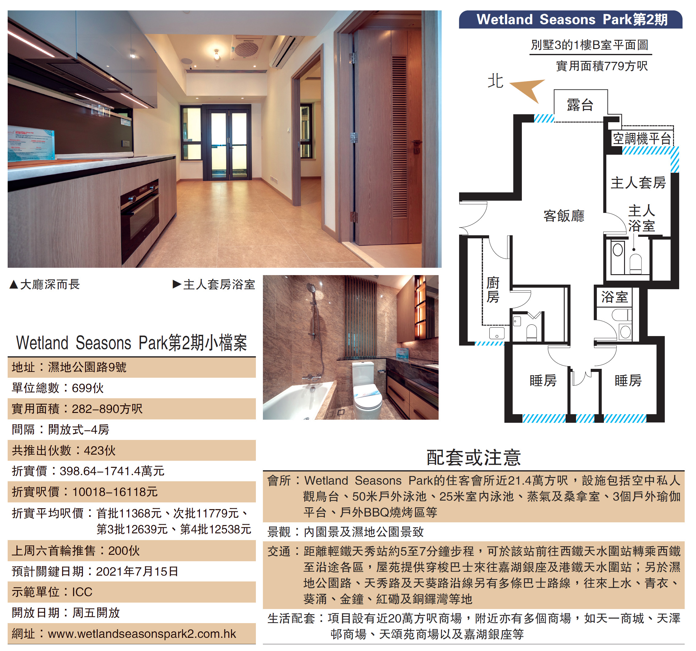 新地(00016)旗下天水圍Wetland Seasons Park第1期年初熱賣,發展商趁近月市況轉旺及新冠肺炎疫情趨緩和推售第2期,戶型與首期相若,提供1至4房,1房面積282方呎起,比1期1房296方呎起略細,細絕天水圍,另今期有60伙別墅單位供應。\大公報記者 梁穎賢