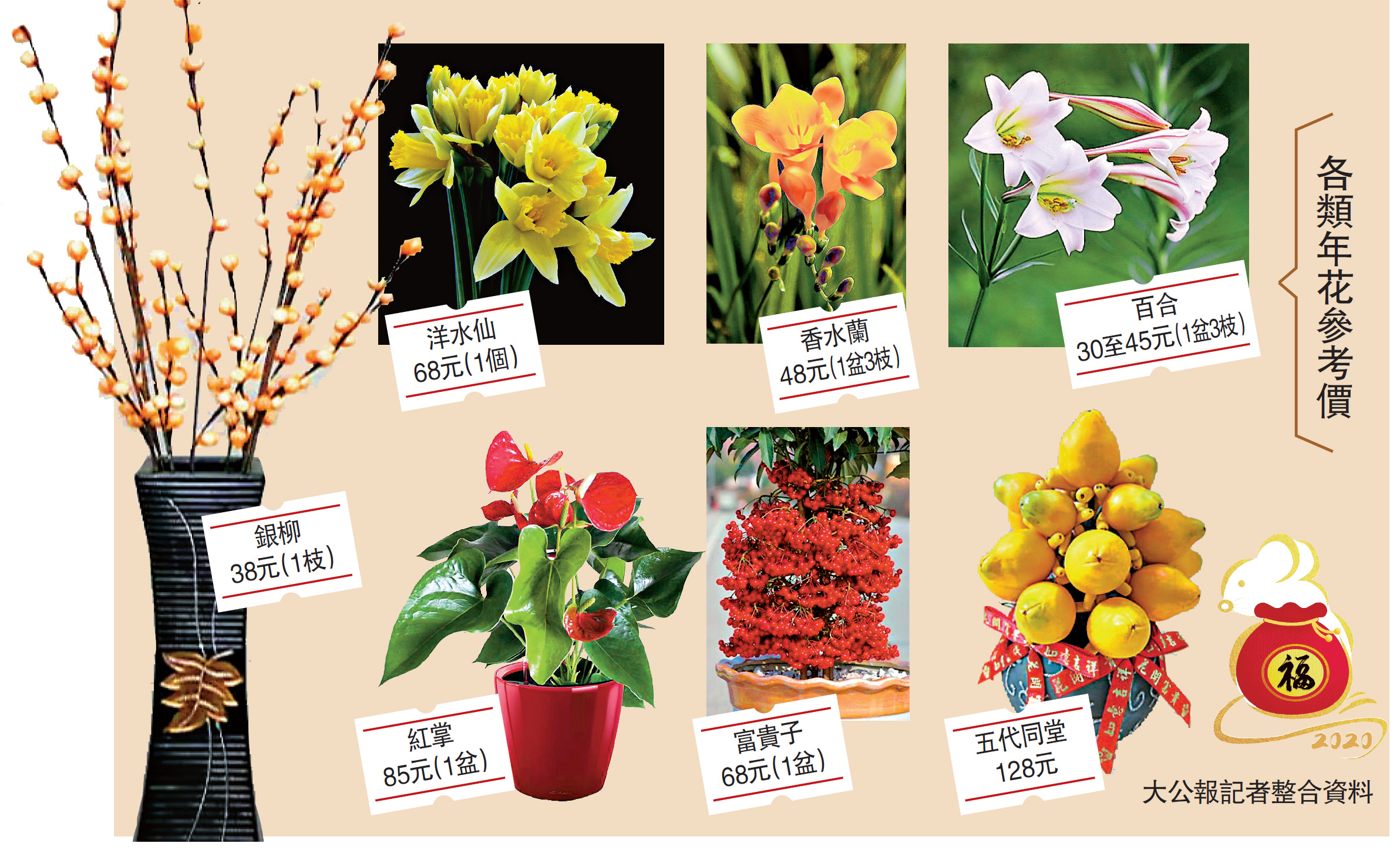 富記鮮花批發負責人鄭智富則稱,今年水仙、百合、劍蘭大豐收。以花墟各店價格作參考,8頭水仙約38元;百合一紮三至四枝約45元;五層高的「五代同堂」約128元。