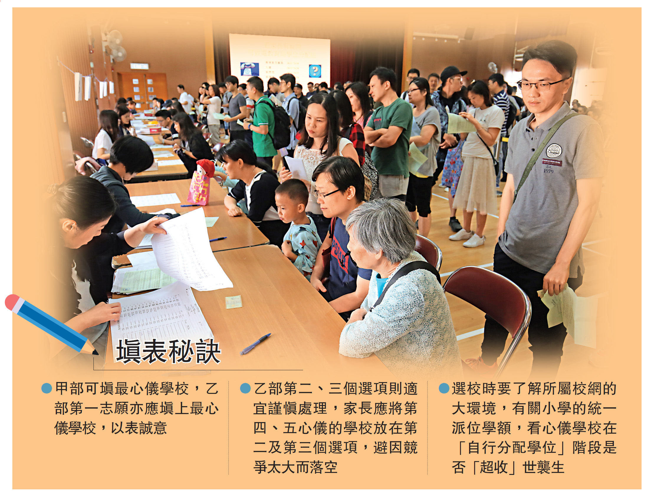 小一統一派位將於本月18及19日遞交選校表格,若子女準備今年九月升讀小一,但在去年11月公布的「自行分配學位」階段落空,又仍未獲直資或私校取錄,家長須到指定的派位中心為子女辦理選校手續。小一統一派位俗稱「大抽獎」,講彩數之餘也有填表秘訣,相信各位爸媽正為填表而煩惱,不妨聽聽小學校長和升學專家教路,再參考過往相關數據,增添入讀心儀小學的機會。\大公報記者 劉家莉
