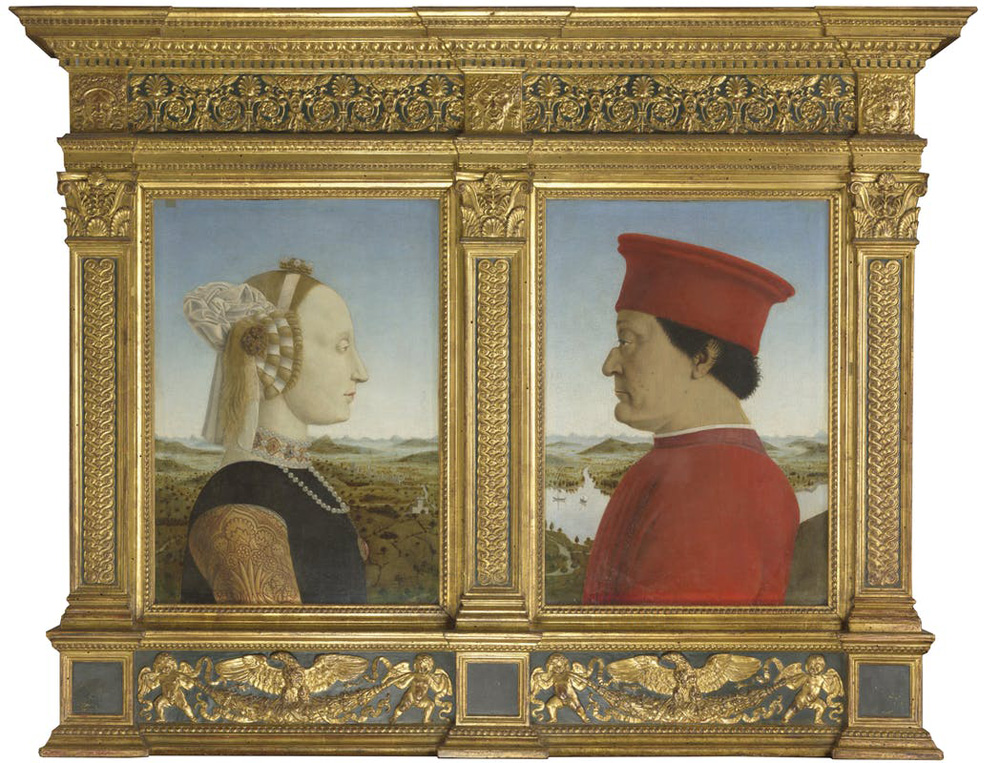 在十五世紀文藝復興時期,包括羅伯特.康平、揚.凡.艾克和凡.德.維登在內的尼德蘭畫派大師們引領了四分之三側姿半身肖像畫的風潮;而在意大利同期最流行的肖像畫風格卻是輪廓清晰的全側臉式。此類可喚起觀者對古羅馬錢幣圖案記憶的構圖方式顯然符合文藝復興思潮的溯古情懷。由皮耶羅.德拉.弗朗切斯卡繪製的《烏爾比諾公爵夫婦雙聯畫》便是此風格最具代表性的名作之一。畫家以夫妻二人面對面的雙聯畫形式描繪了他最重要的贊助者:烏爾比諾公爵費德里科.達.蒙特菲爾特羅和他的妻子巴蒂斯塔.斯福扎;並以他所擅長的透視法和尼德蘭畫派中的鳥瞰風景巧妙結合,以公爵的領地──烏爾比諾風光為背景,使兩幅肖像雖獨立卻相互關聯。弗朗切斯卡之所以選擇用全側臉式為公爵繪製肖像並不單純是順應流行趨勢,只因公爵的右眼曾在戰場中失明,僅呈現毫髮未損的左臉實有「遮醜」之意。其鼻樑處看似突兀的直角狀缺口乃是完全的寫實描繪:公爵命人切掉部分鼻樑為了不影響右眼失明所帶來的視力障礙。這幅作品也意外地成為最早紀錄整容的圖像作品。公爵醒目的紅色衣帽暗指他和教皇的關係;而其夫人精緻的服飾、所佩戴的頭飾及珠寶不僅反映了當時的衣着時尚,還凸顯了她尊貴的身份和社會地位。在雙聯畫的背面則繪有另兩幅名為《凱旋》,歌頌公爵夫婦美德的寓意畫。
