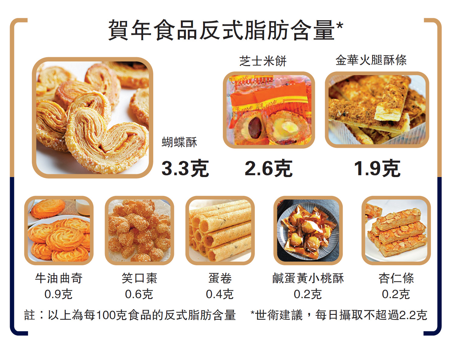 農曆新年將至,註冊營養師林思為指出,市面上常見的賀年食品及禮盒,例如熱賣的油角、笑口棗、曲奇餅、蝴蝶酥、蛋卷和酥條等,每100克含有約0.2-3.3克反式脂肪,進食少量已超出世衛所列的標準(每日攝取不超過2.2克反式脂肪)。